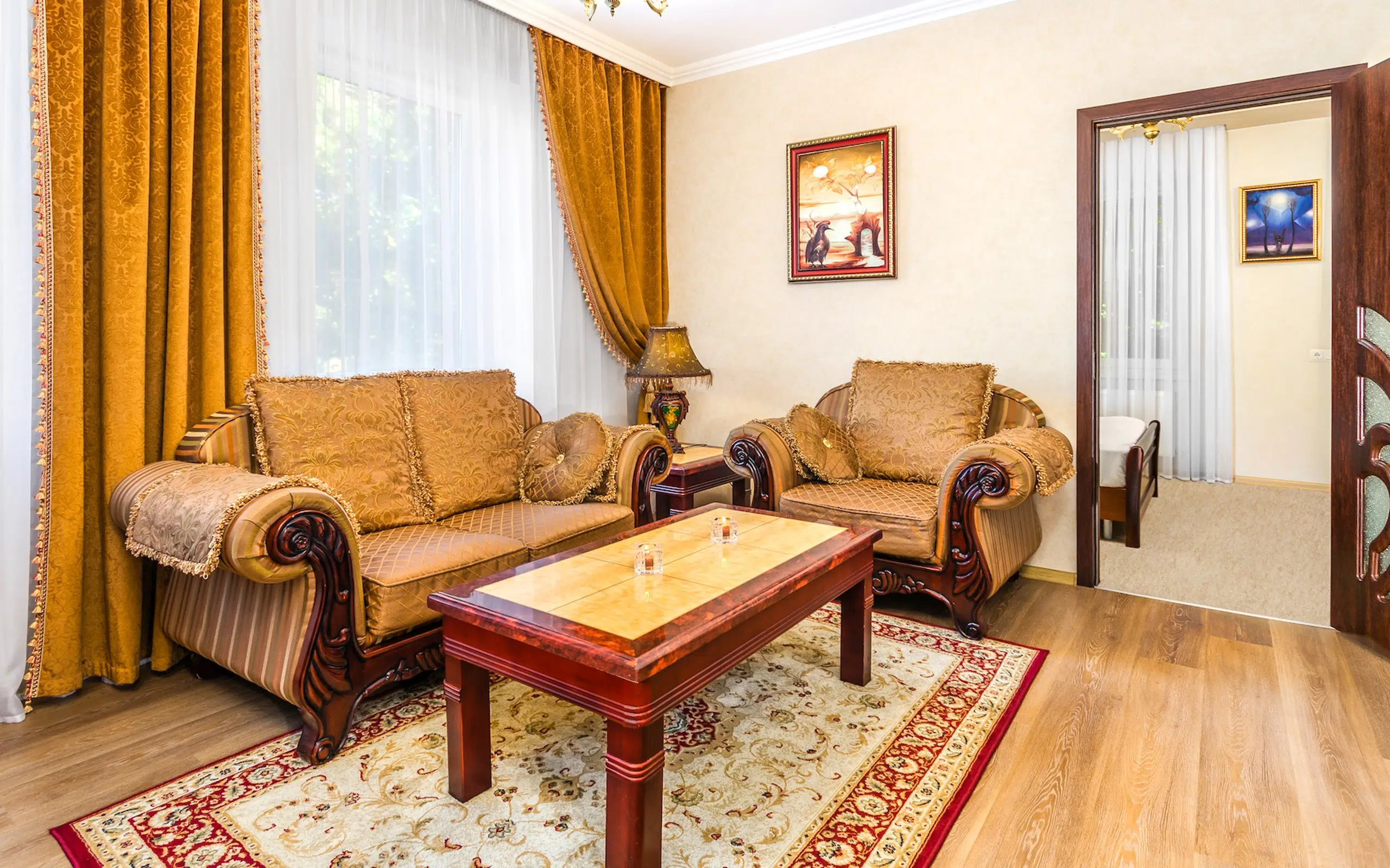 We offer refined comfort without the hustle and bustle of a traditional hotel. Our exclusive hotel features eight spacious three-room suites, each 75 m², exquisitely designed in a neoclassical style. From the moment you book, a dedicated personal concierge will be at your service — arranging transfers, organizing excursions, and assisting with any request.